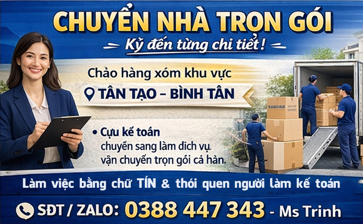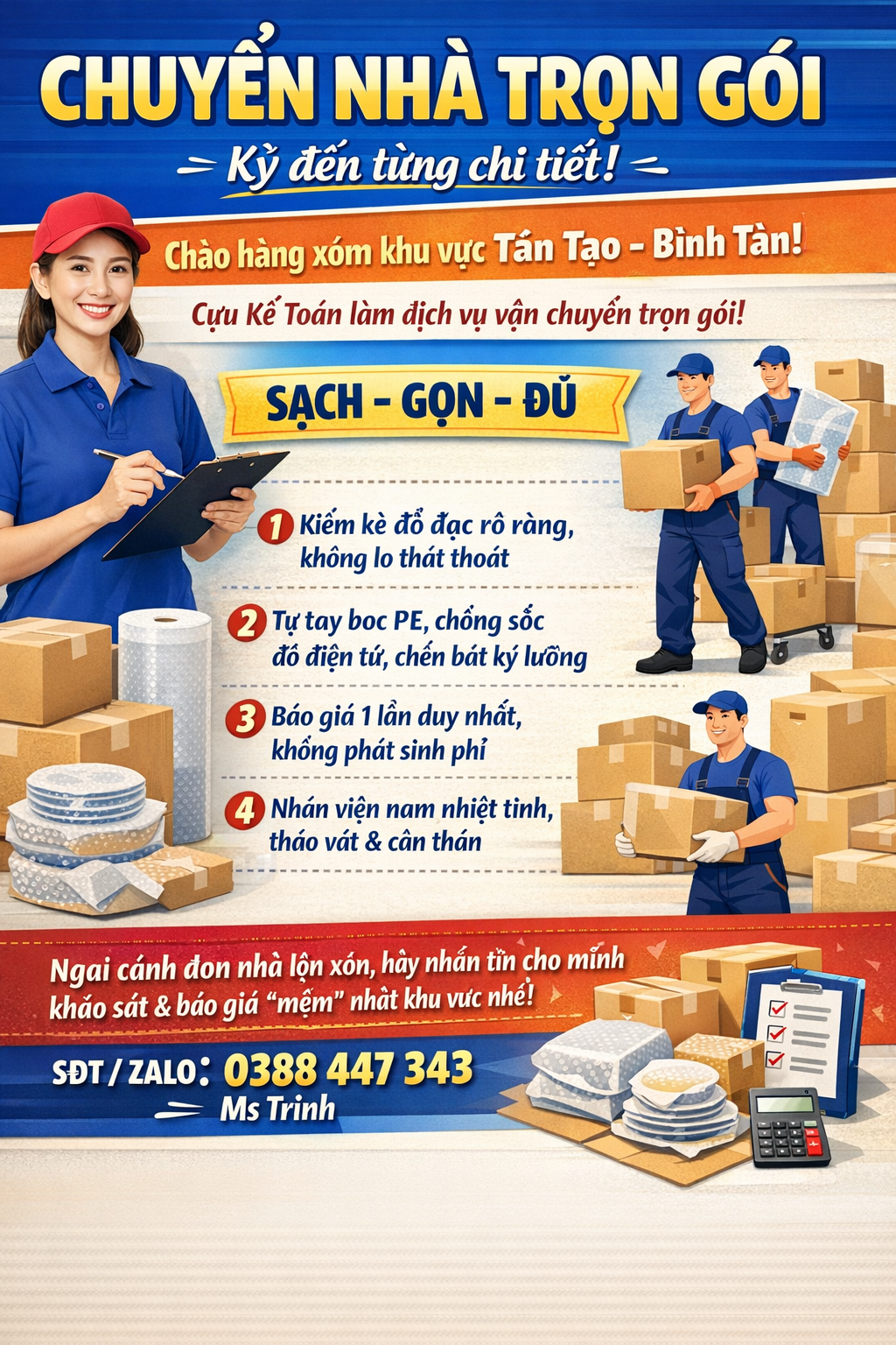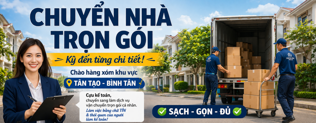 Chào hàng xóm khu vực Tân Tạo Bình Tân. Mình là cựu kế toán, chuyển sang làm dịch vụ vận chuyển trọn gói cá nhân. Với thói quen nghề nghiệp cũ, mình cam kết mang đến dịch vụ vận chuyển nhà : sạch – gọn – đủ.